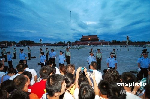 2008年8月1日為我解放軍建軍81周年紀念,天安門廣場舉行盛大升旗儀式,各地游客、奧運期間造訪北京的外國友人一同觀看。中新社發(fā) 侯宇 攝