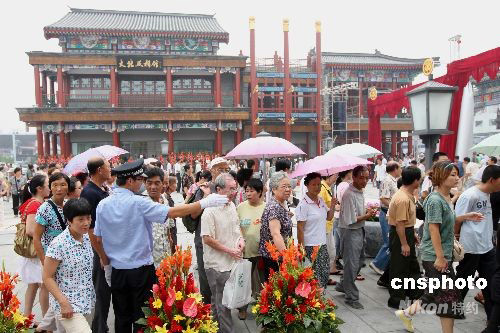 8月7日,眾多北京市民及外地游客在警察的疏導(dǎo)下,有次序地參觀改造后的北京前門(mén)大街。當(dāng)日,北京前門(mén)大街正式對(duì)外開(kāi)放。經(jīng)過(guò)2年多的擴(kuò)建、改造,老牌樓、有軌電車(chē)、老字號(hào)店鋪重現(xiàn)老北京時(shí)的風(fēng)貌。中新社發(fā) 史利 攝