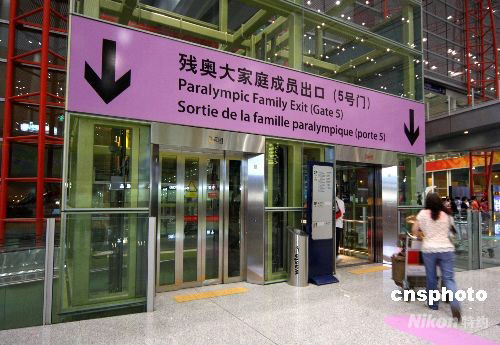 8月26日,距離殘奧會開幕還有10天,北京首都機(jī)場T3航站樓設(shè)立了殘奧會專門電梯通道,準(zhǔn)備迎接各國殘疾人運動員。中新社發(fā) 吳芒子 攝