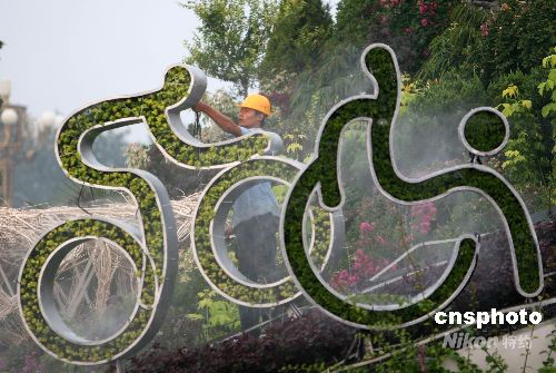 2008年8月27日,工作人員在天安門(mén)廣場(chǎng)布置殘奧會(huì)景觀,更換新鮮花卉。為迎接即將于9月6日開(kāi)幕的北京殘奧會(huì),天安門(mén)廣場(chǎng)北京殘奧會(huì)景觀布置工作正在加緊進(jìn)行中。中新社發(fā) 魯谷 攝