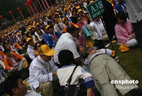 9月12日上午,2008年中國(guó)湖南國(guó)際旅游節(jié)在張家界國(guó)家森林公園開幕,湖南借助國(guó)際旅游節(jié)這一機(jī)遇向世界展示自身獨(dú)特的旅游資源和旅游產(chǎn)業(yè)發(fā)展?fàn)顩r。500余名境內(nèi)外旅行商和媒體記者受邀觀看開幕式表演,一位胖老外坐著看覺得不舒服,直接躺在草地上,引起了一場(chǎng)小誤會(huì)。中新社發(fā) 張家根 攝