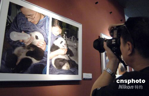 9月18日,《與大熊貓同在》攝影展在北京“大眾影廊”開幕,展示“5.12”汶川大地震后,四川臥龍保護大熊貓研究中心工作人員拍攝的近40幅攝影作品,記錄了救護國寶的一個個感人瞬間。震后出生在雅安碧峰峽基地的第一對雙胞胎熊貓寶寶照片,成為影展的焦點。中新社發(fā) 徐曦弋 攝