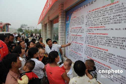 9月20日,六安市人民醫(yī)院的專家在向家長介紹奶粉導(dǎo)致泌尿系統(tǒng)結(jié)石的原因及篩查治療辦法。當(dāng)日,安徽六安市食用含三聚氰胺奶粉嬰幼兒篩查和救治工作全面展開,全市確定11家定點收治和132家篩查醫(yī)院,免費為食用“問題奶粉”的嬰幼兒篩查治療。中新社發(fā) 陳超平 攝