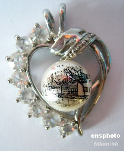 9月21日,郭克杰在珍珠上雕刻的微雕作品《拙政園》。當(dāng)日,蘇州民間藝人、微雕師郭克杰花費近一個月的時間創(chuàng)作出的珍珠微雕作品“蘇州拙政園”亮相。這顆直徑約一厘米的珍珠上的精美圖案令人嘖嘖稱奇。中新社發(fā) 李俊鋒 攝