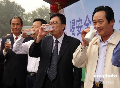 9月25日,在石家莊市最繁華的先天下購物廣場,該市副市長張殿奎(右二)帶頭將滿滿一大杯某品牌純牛奶一飲而盡,隨行的石家莊市工商局、質(zhì)量技術(shù)監(jiān)督局、商務(wù)局等相關(guān)部門負(fù)責(zé)人也紛紛效仿,將手中品牌各異的滿杯純牛奶全部喝下,以消除此間民眾因三鹿問題奶粉事件而產(chǎn)生的顧慮。