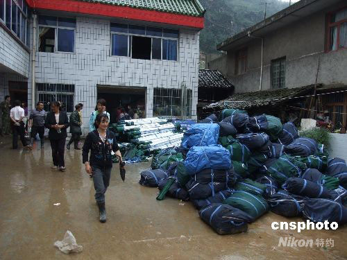 地震重災(zāi)區(qū)四川省北川縣連日暴雨襲擊。從24日起,綿陽市緊急調(diào)運(yùn)大批帳蓬、棉被、食品、飲用水、藥品等救災(zāi)物資及生活用品,確保受災(zāi)民眾基本生活需要。圖為25日中午一些北川受災(zāi)民眾正在任家坪村委會領(lǐng)取救災(zāi)物資。中新社發(fā) 王建 攝