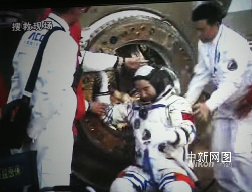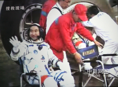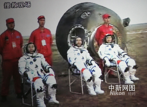 北京時(shí)間二十八日十八點(diǎn)二十二分,神舟七號(hào)航天員翟志剛、劉伯明、景海鵬依次出艙(攝于北京航天飛控中心大屏幕)。中新社記者 齊彬攝