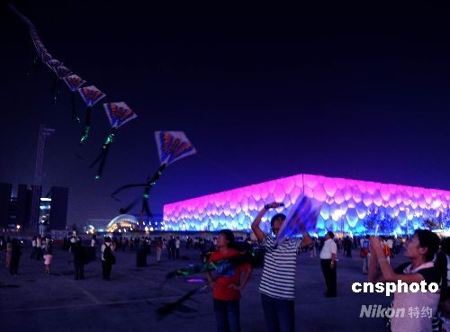 北京市民在十一國(guó)慶長(zhǎng)假夜晚,在北京奧運(yùn)會(huì)主游泳館國(guó)家游泳中心“水立方”外放飛風(fēng)箏。中新社發(fā) 賈國(guó)榮 攝