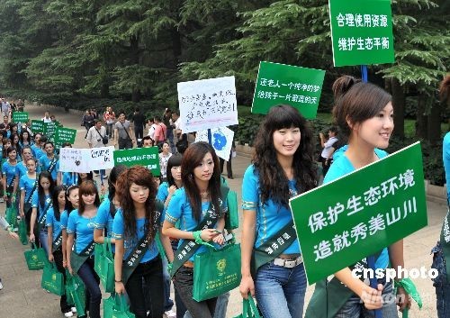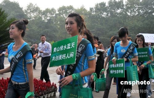 2008年10月3日,參加“中國國際年度綠色風(fēng)云人物”頒獎(jiǎng)盛典暨“MISS EARTH世界綠色環(huán)保大賽中國總決賽”的來自全國27個(gè)省、直轄市、自治區(qū)的40位“綠色天使”手拿宣傳牌、環(huán)保袋等物品來到南京中山陵風(fēng)景區(qū),參加公益環(huán)保宣傳活動。中新社發(fā) 劉建民 攝