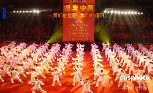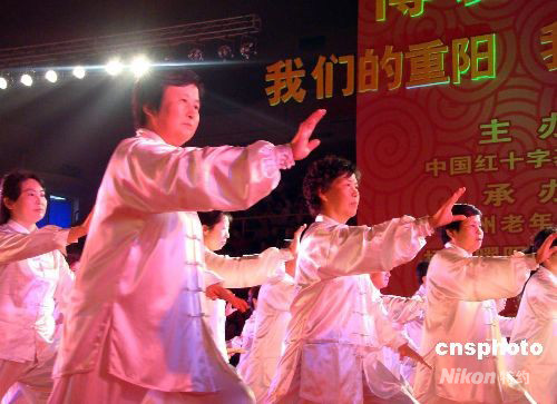 10月6日,揚(yáng)州150位老人同臺表演太極拳。當(dāng)天,由中國紅十字基金會主辦的“博愛中國•我們的重陽”大聯(lián)歡活動在江蘇揚(yáng)州市體育場舉行,近千名老年朋友歡聚一堂,表演并觀看精彩紛呈的文藝演出,喜迎重陽節(jié)。 中新社發(fā) 陳中秋 攝