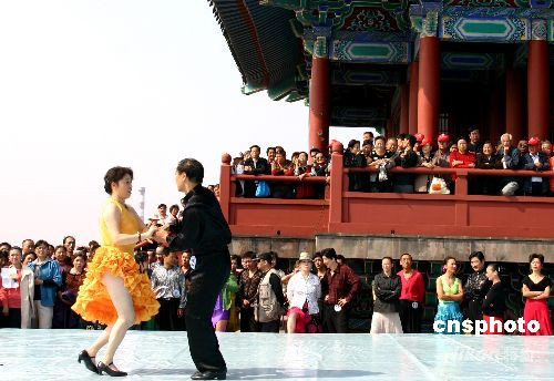 10月7日是一年一度的重陽(yáng)節(jié),閱江樓杯“小拉舞”精英賽總決賽在南京閱江樓景區(qū)舉行,通過預(yù)賽的20對(duì)中老年小拉舞愛好者在決賽中翩翩起舞,歡度重陽(yáng)節(jié)的到來。中新社發(fā) 阿董 攝