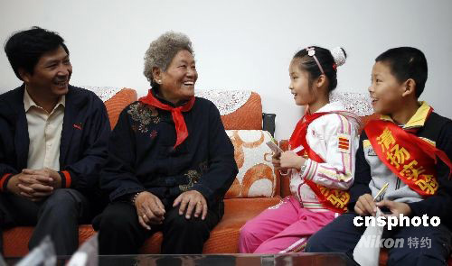 10月7日重陽節(jié),無錫市清揚實驗小學(xué)為提高少先隊員尊老、敬老、愛老意識,進一步營造全社會尊老愛老氛圍,結(jié)合“喜看家鄉(xiāng)改革開放30年巨變”,開展“和諧小使者訪名人”活動。在世界上第一個從北坡登上珠峰的女英雄——潘多的家中,無錫市清揚實驗小學(xué)的少先隊員們與潘多奶奶面對面地交流著。潘多奶奶勉勵少先隊員要在學(xué)習(xí)上要發(fā)揚“攀登”精神,克服困難,勇攀學(xué)習(xí)高峰。 中新社發(fā) 張浩 攝