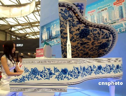 10月9日,身穿旗袍的美女在上海樂器展中彈奏鋼琴。琴身上描繪著中國(guó)傳統(tǒng)青花瓷紋飾,透出濃郁的古典韻味。 中新社發(fā) 井韋 攝
