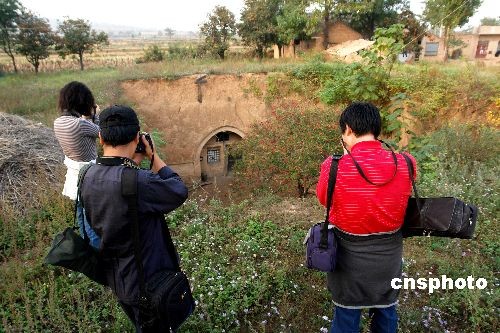 2008年10月12日,幾名攝影愛好者在山西平陸張店鄉(xiāng)侯王村拍攝地窨院。地窨院是黃土高原地貌區(qū)域里一種獨(dú)特的民居,距今已有千年的歷史,但隨著人們生活水平的提高和地窨院陰暗潮濕的特點(diǎn),目前居住在這里的人們正在搬出地窨院,來到地面上生活,這種奇特的民居正在逐漸消失。平陸縣張店鄉(xiāng)是山西目前地窨院存在較多的鄉(xiāng)鎮(zhèn)。中新社發(fā) 寶成 攝