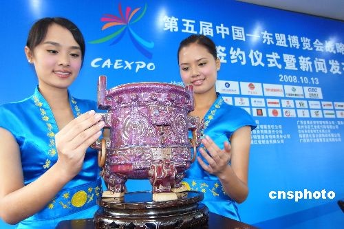10月13日,由河南禹州孔家鈞窯燒制的2008中國—東盟博覽會鈞瓷國禮《象天鼎》運抵廣西南寧,作品由中國工藝美術大師孔相卿設計,以中國古老的青銅禮器“鼎”為基本造型設計制作,表達了中國與東盟國家互利合作、共享繁榮的美好愿望。據(jù)悉,第五屆中國—東盟博覽會將于10月22日—25日在中國廣西南寧舉行,《象天鼎》將作為國禮,贈送給參加博覽會的各國政要。中新社發(fā) 牛書培 攝