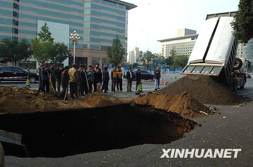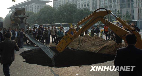 10月17日,北京西長安街西單文化廣場附近路面發(fā)生塌陷,目前有關(guān)部門正在積極進(jìn)行搶修。新華社記者公磊攝