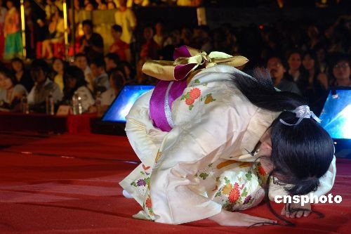 圖為日本留學(xué)生細(xì)井春香等人表演的服裝秀《和服韻》。