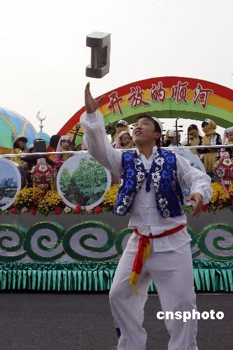 在菊花會(huì)開幕式上具有民族特色的石鎖表演。