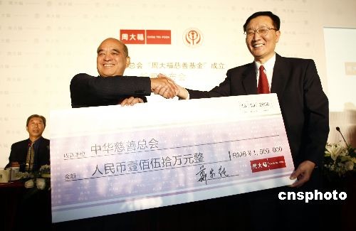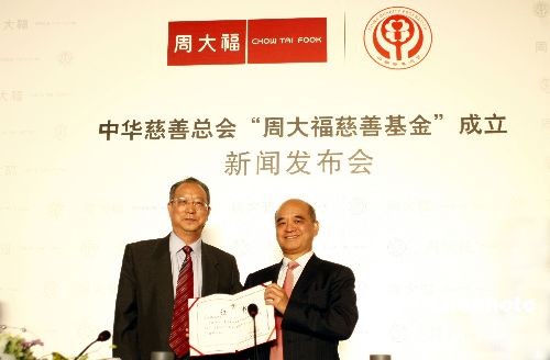 10月中旬,周大福集團與中華慈善總會在京召開新聞發(fā)布會,宣布 “周大福慈善基金” 正式成立。發(fā)布會上,全國政協(xié)常委、中華慈善總會榮譽會長、周大福集團董事總經(jīng)理鄭家純博士代表周大福集團,向中華慈善總會轉(zhuǎn)交了“基金”首筆慈善捐款150萬元,用以啟動開展“基金”第一階段助學(xué)助孤慈善項目。全國人大代表、中華慈善總會副會長李本公,中華慈善總會副會長張道誠,中華慈善總會秘書長劉國林,副秘書長韓京津出席了儀式,并向鄭家純博士頒發(fā)了捐贈證書和榮譽會長證書。中新社發(fā) 楊可佳 攝