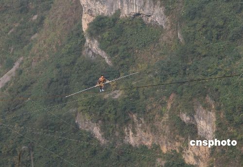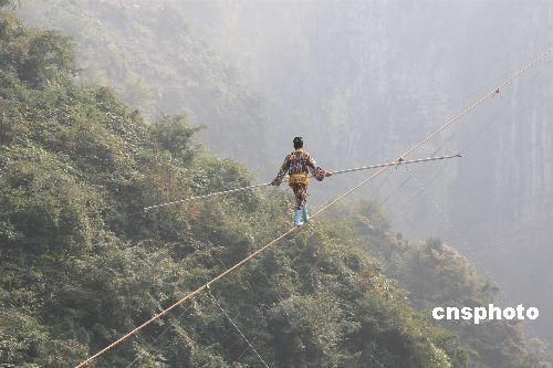 18日,“高空王子”阿迪力的親侄子賽買提·艾江在張家界天門(mén)山的萬(wàn)仞絕壁之間展示了“達(dá)瓦孜”的驚人絕技。雖然賽買提在最后50米處意外“失手”,被救援人員接回終點(diǎn),但在傾斜達(dá)39度的鋼繩上行走了650米,已經(jīng)成功挑戰(zhàn)了世界最大斜度的高空走鋼絲極限!斑_(dá)瓦孜”意思是“高空走繩索”,是新疆維吾爾族歷史悠久的民間傳統(tǒng)絕技。中新社發(fā) 鄧霞 攝