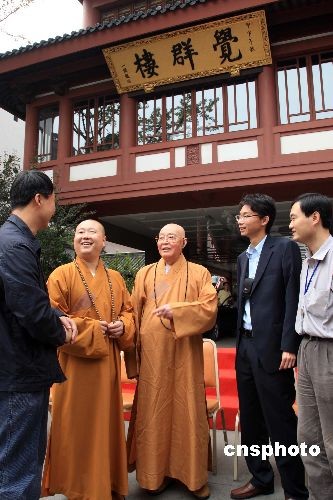 10月22日,高校佛學(xué)專家們與上海玉佛寺方丈覺醒法師(左二)、真如寺妙靈長老(中)參加“佛教與生態(tài)文明”學(xué)術(shù)研討會。當日,“佛教與生態(tài)文明”學(xué)術(shù)研討會在上海佛門圣地玉佛寺召開,中國高等院校著名學(xué)者、佛教界法師、居士數(shù)百人參會。中新社發(fā) 潘索菲 攝