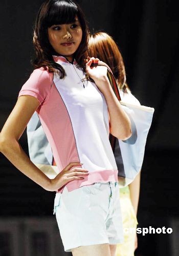 10月22日晚,2009春夏中國T恤流行趨勢發(fā)布暨“天然杯”第六屆國際T恤設(shè)計大賽作品展在上海舉行,該大賽吸引來自韓國漢陽大學(xué)、ESMOD國際服裝學(xué)院、萊弗士服裝學(xué)院等近百所高校的近3000幅作品。圖為模特展示院校T恤設(shè)計優(yōu)秀作品。中新社發(fā) 錢興強 攝