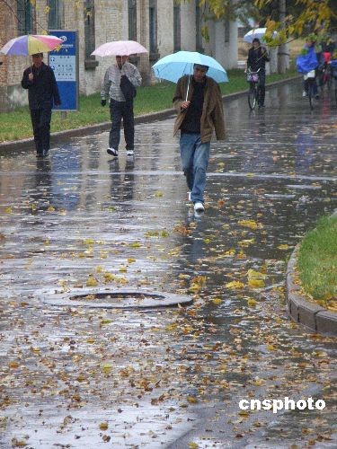 10月23日,齊齊哈爾市民走在深秋的雨中。當日,齊齊哈爾市出現(xiàn)降雨降溫天氣。中新社發(fā) 王云龍 攝