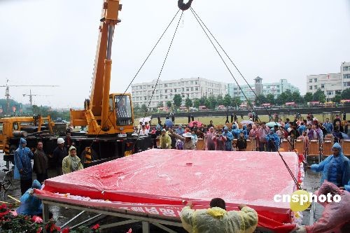 10月26日下午,四川省南溪縣豆腐干食品文化節(jié)現(xiàn)場,一塊長4.21米、寬4.2米、高9.5厘米左右,重達(dá)1.8噸左右的巨型豆腐干特別引人注目,它將于26日晚間揭開紅蓋頭,申報世界吉尼斯紀(jì)錄。 南溪豆腐干制作工藝因技術(shù)獨(dú)特、工藝的傳承人缺乏等原因,已被列入四川省首批非物質(zhì)文化遺產(chǎn)目錄。這次試制的巨型豆腐干全部按照豆腐干傳統(tǒng)工藝制作。數(shù)十名技術(shù)骨干和工人經(jīng)30多個小時的辛勤勞作,共使用了黃豆1300余公斤。中新社發(fā) 陳涌 攝