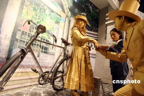 10月28日,行為藝術(shù)者在河北省霸州市新落成的華夏民間收藏館自行車博物館內(nèi)表演,表演者倚靠的是著名民間收藏家王明璽老人收藏的1910年英國(guó)生產(chǎn)的白金人牌自行車。該車只生產(chǎn)了100輛,進(jìn)入中國(guó)10輛,這是目前發(fā)現(xiàn)保存最為完好的一輛。當(dāng)日,第二屆霸州文化藝術(shù)節(jié)在河北省霸州市隆重開幕。中新社發(fā) 毛建軍 攝