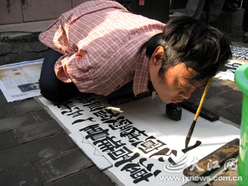 “真厲害!用手寫出這么好的毛筆字都難,何況是用頭寫。”28日上午,許多市民在南昌八一大橋下圍觀一名用頭寫字的乞討者,市民贊賞之余不斷將錢投入乞討者的塑料桶里,甚至有市民花高價購買乞討者的書法。