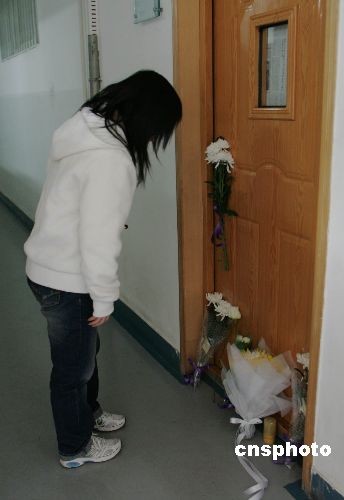 2008年10月29日下午,中國(guó)政法大學(xué)師生在事發(fā)地點(diǎn)悼念昨日遇害的程春明教授。10月28日晚,中國(guó)政法大學(xué)昌平校區(qū)內(nèi),正準(zhǔn)備上課的副教授程春明被一名大四男生砍成重傷,經(jīng)搶救無(wú)效死亡。中新社發(fā) rain 攝