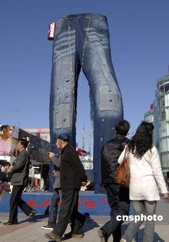 10月31日,北京王府井金街上的某商家樹起巨型牛仔褲招牌造型,吸引路人目光。在全球金融危機(jī)大背景下,眾多商家不得不利用各種新奇手法賺人眼球。中新社發(fā) 徐曦弋 攝
