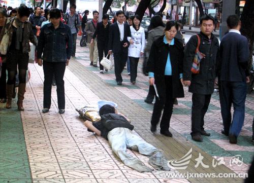 3日下午5時(shí)許,一個(gè)20出頭“高位截肢”的小伙艱難爬行在南昌市中山路人行道上,向路人訴說不幸遭遇:“一場車禍奪走了父母的生命,我也因這場車禍高位截肢!币恍┖眯氖忻褚姞睿娂娍犊饽。傍晚6時(shí)30分許,“截肢”小伙爬進(jìn)了一條小巷內(nèi),另一男子提來了一大包衣服。這時(shí),“截肢”小伙突然站了起來,換上一套時(shí)尚的休閑裝?吹接浾吲恼眨瑑扇搜杆傧。(文/圖劉虎記者歐陽蘇敏)