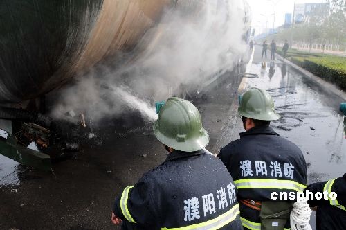 11月5日上午,位于河南省濮陽市濮鶴高速收費站東一公里處,一輛從河北省邯鄲市往濮陽市運輸散裝水泥原料潮石粉的歐曼重型卡車剛下高速公路,正在行駛時突然發(fā)生輪胎著火事故。在當?shù)叵拦俦目焖偬幹孟拢馂?zāi)得到及時撲滅。中新社發(fā) 劉敬寬 攝