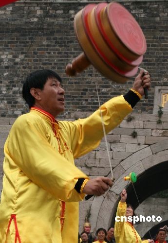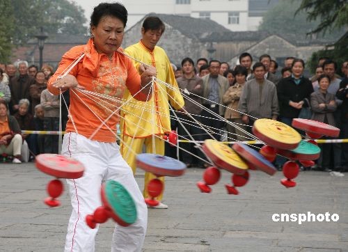11月6日,在南京中華門城堡廣場舉行的2008中國南京第二屆民間藝術(shù)節(jié)廣場活動上,由南京市空竹協(xié)會數(shù)十位空竹愛好者展示的空竹絕技,吸引了眾多市民和游客。中新社發(fā) 鐘山 攝