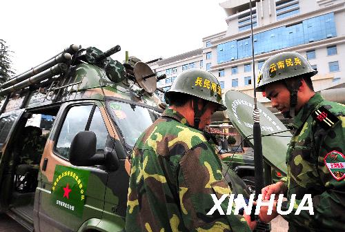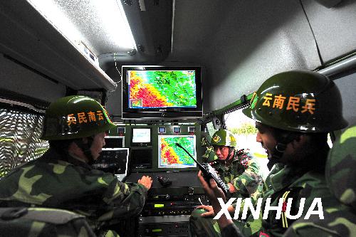 在云南楚雄等地發(fā)生滑坡泥石流災(zāi)害后,云南民兵預(yù)備役應(yīng)急通信分隊派出安裝著地理信息、GPS定位、衛(wèi)星圖像傳輸、微波無線通信等車載工作系統(tǒng)組合的移動指揮車及數(shù)輛前方信息偵察車,用科技手段為救災(zāi)工作提供精確信息和清晰圖像。新華社記者 陳海寧 攝