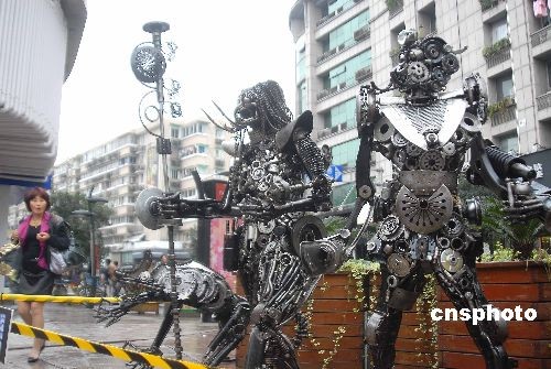 2008年11月8日,鋼鐵俠、怪獸、恐龍、大蟒蛇等9個(gè)“鐵家伙”集體出現(xiàn)在杭州街頭。它們由藝術(shù)家周峰用廢棄的零配件制成,參加以“我·機(jī)器人、創(chuàng)意在武林、創(chuàng)意成就品質(zhì)生活”為主題的“西湖創(chuàng)意市集”武林路站活動。 中新社發(fā) 引煒 攝