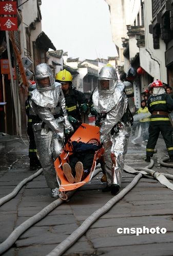 2008年11月10日,安徽黃山市公安消防支隊在屯溪老街進行實地消防演練。當日,安徽黃山市公安消防支隊會同相關(guān)部門在全國歷史文化保護區(qū)的屯溪老街進行實地消防演練。據(jù)了解,眼下正進入火災(zāi)的高發(fā)期,屯溪老街在國內(nèi)外享有較高的知名度和美譽度,是黃山市寶貴的徽州文化歷史遺產(chǎn)和重要的旅游窗口,每年接待中外游客達600萬人次。按照屯溪老街消防安全應(yīng)急預(yù)案的要求,適時進行消防檢查和實地消防演練,以增強對屯溪老街磚木結(jié)構(gòu)古建筑群發(fā)生火災(zāi)的處置能力。中新社發(fā) 方也廣德 攝