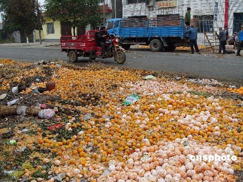 2008年11月10日,湖北宜昌市夷陵區(qū)鴉鵲嶺鎮(zhèn),被當(dāng)成垃圾傾倒在路邊的柑橘隨處可見。據(jù)悉,受四川廣元“蛆柑”事件影響,沒有出現(xiàn)疫情的湖北省柑橘外銷曾一度全面停滯,經(jīng)有關(guān)有關(guān)部門“救市”后,目前銷售量已恢復(fù)到正常水平的85%,但柑橘收購價(jià)較往年暴跌,而且收購商對柑橘的大小、品相等要求嚴(yán)格,導(dǎo)致大量“等外品”柑橘被當(dāng)成垃圾倒掉,經(jīng)濟(jì)損失慘重,成為橘農(nóng)們的錐心之痛。中新社發(fā) 劉君鳳 攝