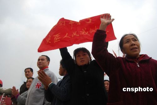 11月10日上午,在北茂公路擂禹段戰(zhàn)斗了180天的第二炮兵某工程團撤離災區(qū),踏上歸途,綿陽各界群眾到公路沿線為官兵們送行。據(jù)四川省軍區(qū)參謀長張培敏少將介紹,這支部隊是迄今為止,堅守四川災區(qū)時間最長的一支救災部隊,也是最后一支撤離的解放軍部隊。中新社發(fā) 胥輝 攝
