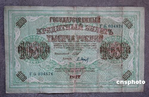 據(jù)考證,山東濱州發(fā)現(xiàn)的這張面值1000元盧布,是俄國克倫斯基臨時政府1917年在中國東北發(fā)行流動的紙幣,它見證了中國的屈辱歷史。中新社發(fā) 梁寶海 攝