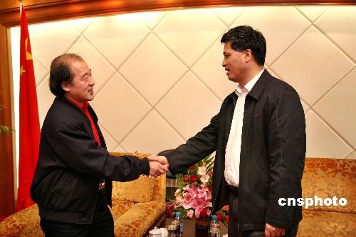 全國政協委員、中國航天科技集團公司黨組書記馬興瑞(右)代表全體航天人向畫作《騰飛》作者、著名畫家王書平教授表示感謝。