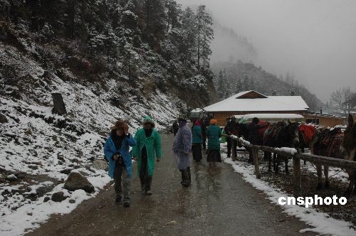 初冬時(shí)節(jié),“最后的香格里拉”——四川稻城亞丁大雪紛飛。圖為在鵝毛般大雪中的藏族趕馬人。中新社發(fā) 肖龍聯(lián) 攝