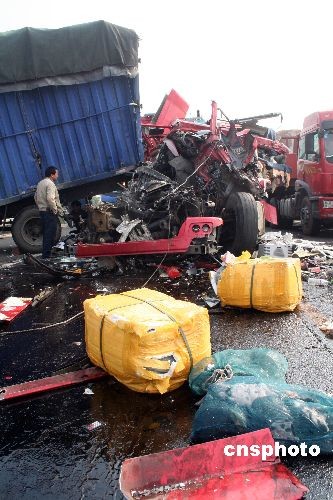 11月14日6時30分,由于受團霧影響,滬昆高速江西東鄉(xiāng)縣195KM--196KM處往南昌方向同時間發(fā)生5起汽車追尾事故,造成16輛貨車追尾,高速公路交通一度受阻。據(jù)了解,事故已造成5人死亡、10人受傷。經(jīng)過當?shù)赜嘘P(guān)部門全力搶救,到上午10時,滬昆高速公路事故路段實行交通疏導(dǎo)分流,恢復(fù)部分交通,目前事故還在進一步清理調(diào)查中。中新社發(fā) 何江華 攝