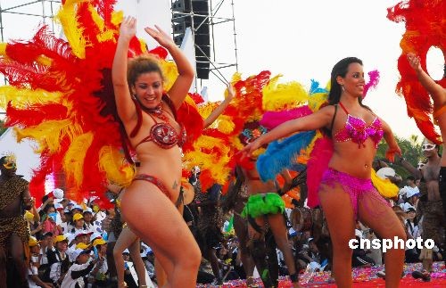 2008年11月16日,在海南省文昌市舉行的第九屆中國(guó)海南島歡樂節(jié)“狂歡大巡游”中,來(lái)自巴西的桑巴舞陣,將濃濃的異域風(fēng)情帶到海南。中新社發(fā) 善平 攝