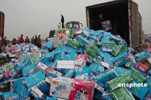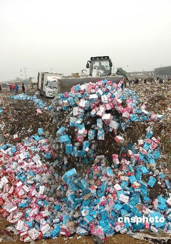 11月17日,河南南陽市臥龍區(qū)在生活垃圾處理場集中銷毀“三鹿”問題液態(tài)奶。當(dāng)日,該區(qū)共銷毀從經(jīng)銷商回收和工商機(jī)關(guān)監(jiān)督統(tǒng)一下架、集中扣押、封存和消費(fèi)者退回的問題“三鹿”純牛奶、酸奶、早餐奶等液態(tài)奶16噸,在生活垃圾場采取碾壓、深埋,進(jìn)行無害化處理。中新社發(fā) 熊運(yùn)彬 攝