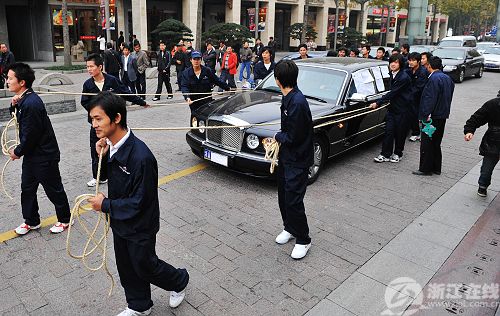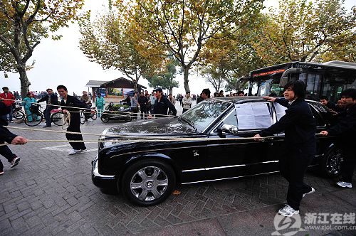 17日,杭州,20多人拉著一輛價(jià)值500多萬的高檔豪華轎車,在西湖邊向路人展示這輛豪華轎車的名不副實(shí)。