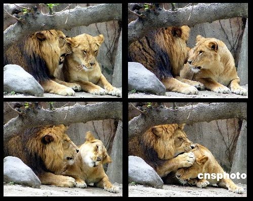 2008年11月18日,上海動物園內(nèi)的兩只獅子在互相依偎取暖。一股較強冷空氣正在氣勢洶洶南下,17日開始影響申城。來自上海氣象部門的消息,這股冷空氣將給申城帶來明顯大風(fēng)降溫,過程降溫幅度6-8℃,19日和20日早晨最低氣溫將跌至5℃左右,有霜或暗霜。中新社發(fā) 井韋 攝