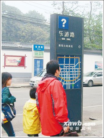 18日下午,大雁塔附近的育才路路口一個約2米高的黑色簇新路牌引人注目,不時有游客打扮的人上前查看道路信息。但是,路牌“育才路”三個漢字上方標示的一個大大的白色“?”號,引起了不少查看者的疑惑。兩名游客先是在路牌下方的城區(qū)交通旅游圖上尋找著“育才路”的方位,而后又仰頭看著“大問號”撓起了頭:“咱們現在是在育才路上嗎?這不會是表示路名待定吧……”