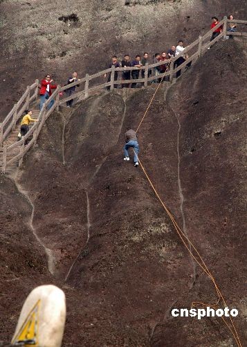 2008年11月17日,福建自然風(fēng)景名勝武夷山每天都吸引許多游客前來(lái)游玩,然而許多游人隨手丟棄的旅游垃圾醒目地散落在秀麗的山間上,為了保護(hù)景區(qū)環(huán)境,工作人員只好在高達(dá)800米陡峭的山間中拾垃圾,被游人喻為武夷山上的“蜘蛛人”。中新社發(fā) 張斌 攝